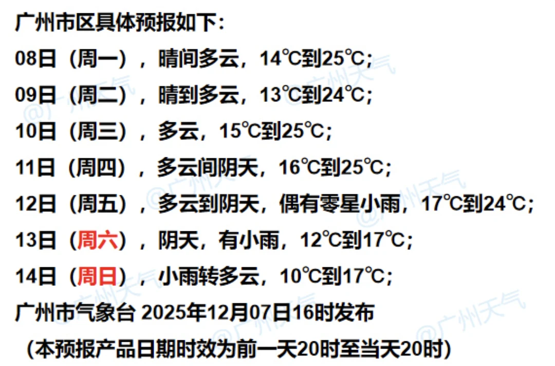 按现有气象资料预计,本周末(13日至14日),广州或经历10~12℃的“低温周末”。预计这股到达广州的寒潮将仍有较强冷空气级别,会为广州带来明显降温、风力增大、伴小雨天气。