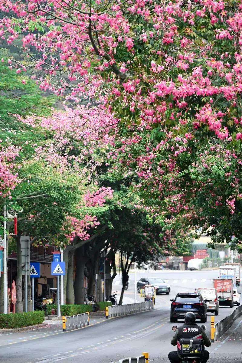 深圳市光明区星湖路变身“花隧道”,公交车穿行其中,恍如误入漫画场景。