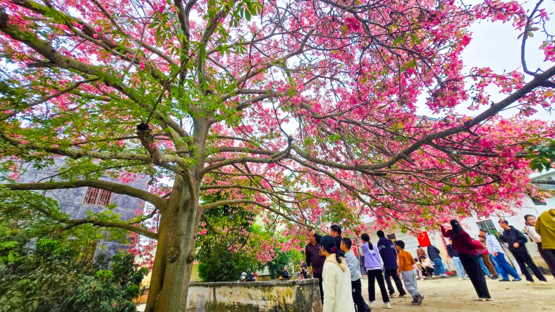云浮罗定罗锦村高大的异木棉盛开成景,繁花掩映白墙村道,让人流连忘返。