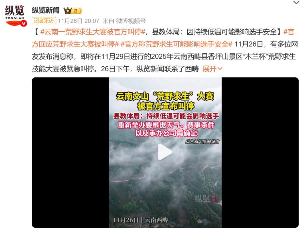 11月26日,有多位网友发布消息称,即将在11月29日进行的2025年云南西畴县香坪山景区“木兰杯”荒野求生技能大赛被紧急叫停。